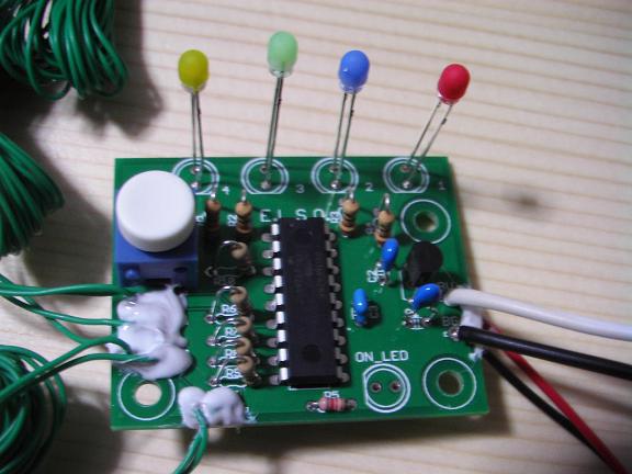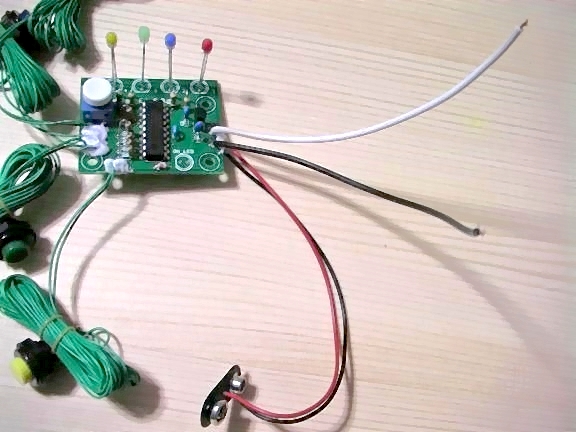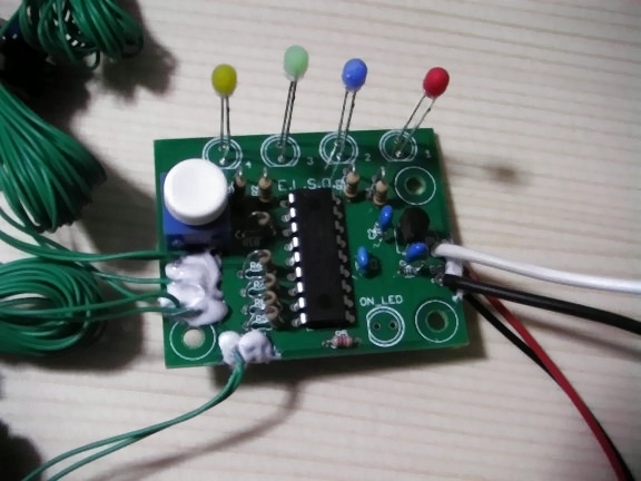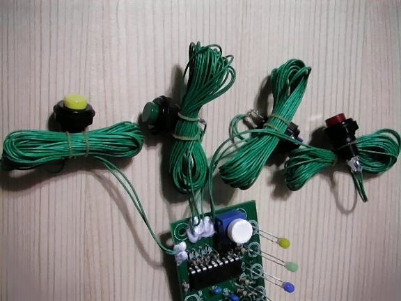 赤・青・緑・黄色の押しボタンスイッチに対応して、一番早かった方からだけの、色が対応したLEDが光ります